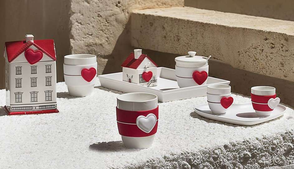 Tazze, tazzine e zuccheriere in ceramica ma non solo: anche alzate e piattini in melamina per una linea fatta col cuore.
